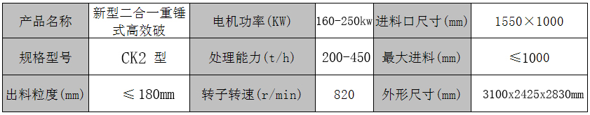 CK2型新型高效節(jié)能型二合一破碎機術(shù)參數(shù):