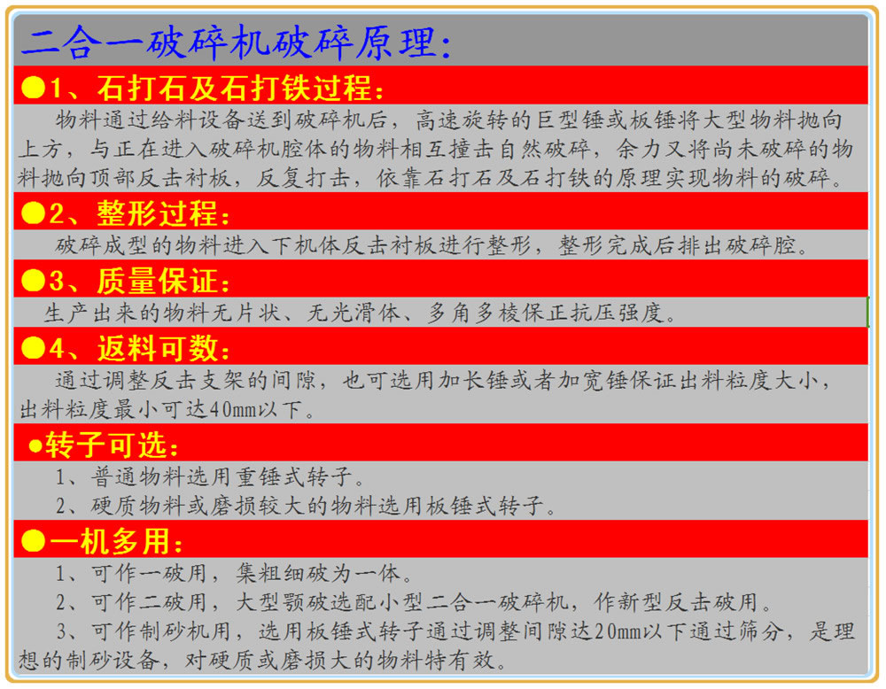 加強型設計:機殼比傳統(tǒng)反擊破加強設計制作,原裝選用國內最好的板錘,大大增加了產品的使用壽命及配件的耐磨程度;